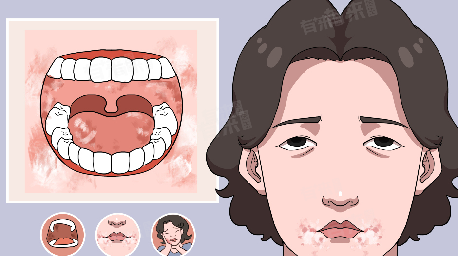 2、黏膜损害:口腔黏膜损害多发于颊黏膜后侧,表现为网状白色或灰白色角化斑或斑块,可伴有疼痛。口腔黏膜上的病损多为左右对称,且多发生于颊部,部分患者可能无痛感,但会有木溲感和烧灼感。生殖器黏膜损害则表现为男性外阴的白色环状皮损,女性则主要为外阴瘙痒、烧灼感等。