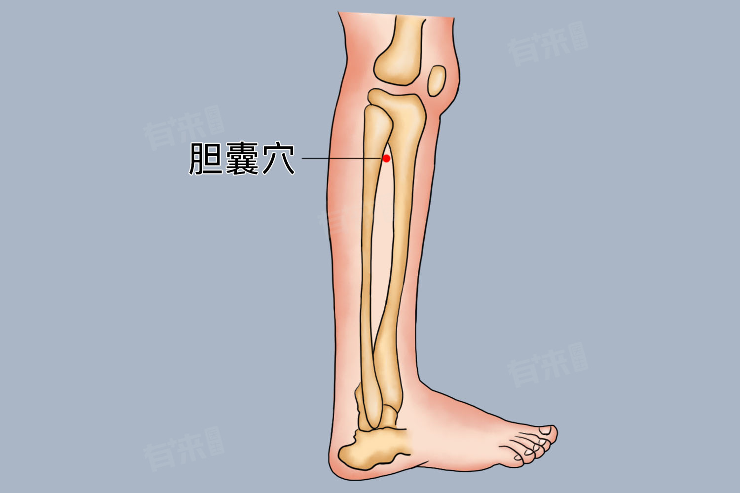 - 胆囊穴位于小腿外侧上部,当腓骨小头前下方凹陷处直下2寸的位置,可以先找到阳陵泉穴,该穴位于腓骨小头前下方45度角凹陷处,然后从此穴直下量取2寸的距离,即为胆囊穴。