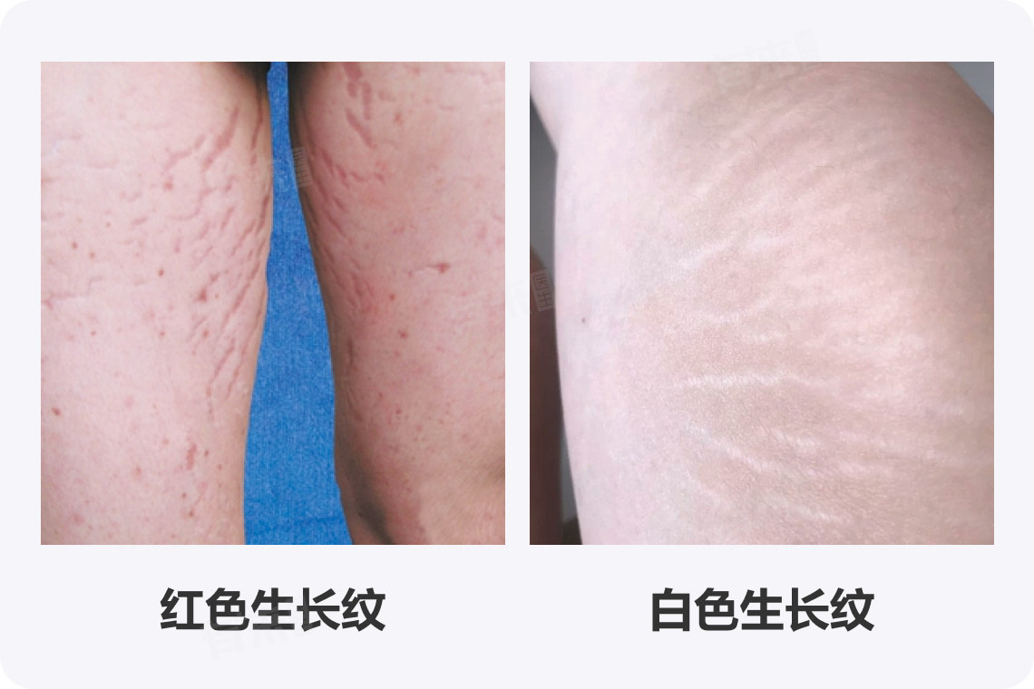 - 生长纹刚出现时,往往呈现红色或紫红色,这是由于皮肤下血管破裂、炎症反应等原因。随着时间推移,这些红色或紫红色会逐渐变淡,变成白色或银白色。这种颜色的改变会让生长纹在视觉上没有那么突兀,给人一种生长纹减轻的感觉,不过这只是视觉上的变化,实际上皮肤的纹理结构改变依然存在。