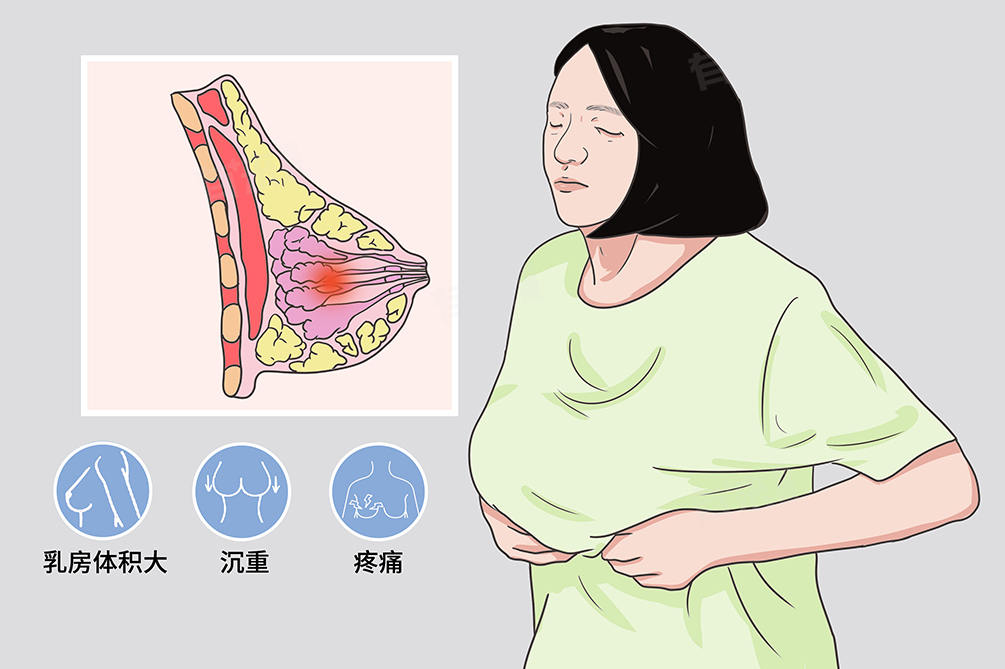 乳房肥大是指乳房过度发育,体积超常,与身体比例明显失调,其常见的原因包括青春期发育因素、肥胖、妊娠与哺乳等,可通过观察、控制体重等方法改善。