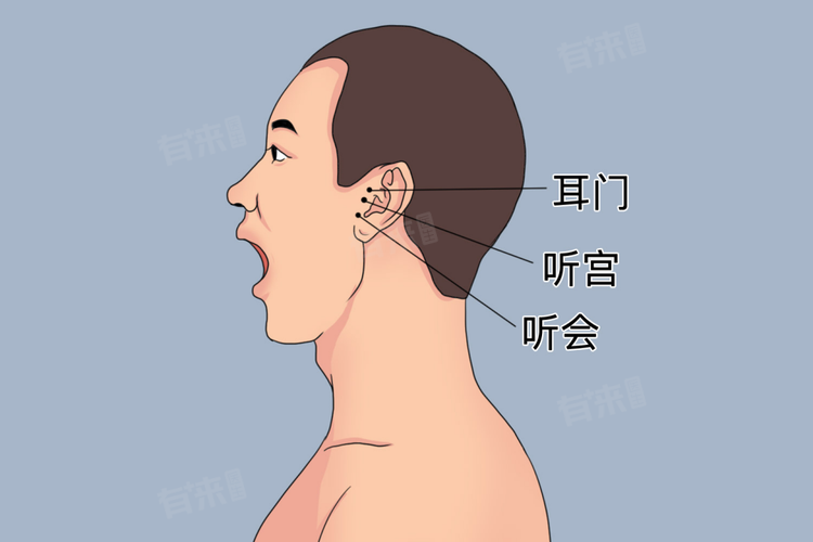 2、听会穴:位于面部耳屏间切迹与下颌骨髁突之间的凹陷中。同样具有聪耳利窍的功效,可配合足三里、上迎香、听宫穴等穴位治疗耳聋。