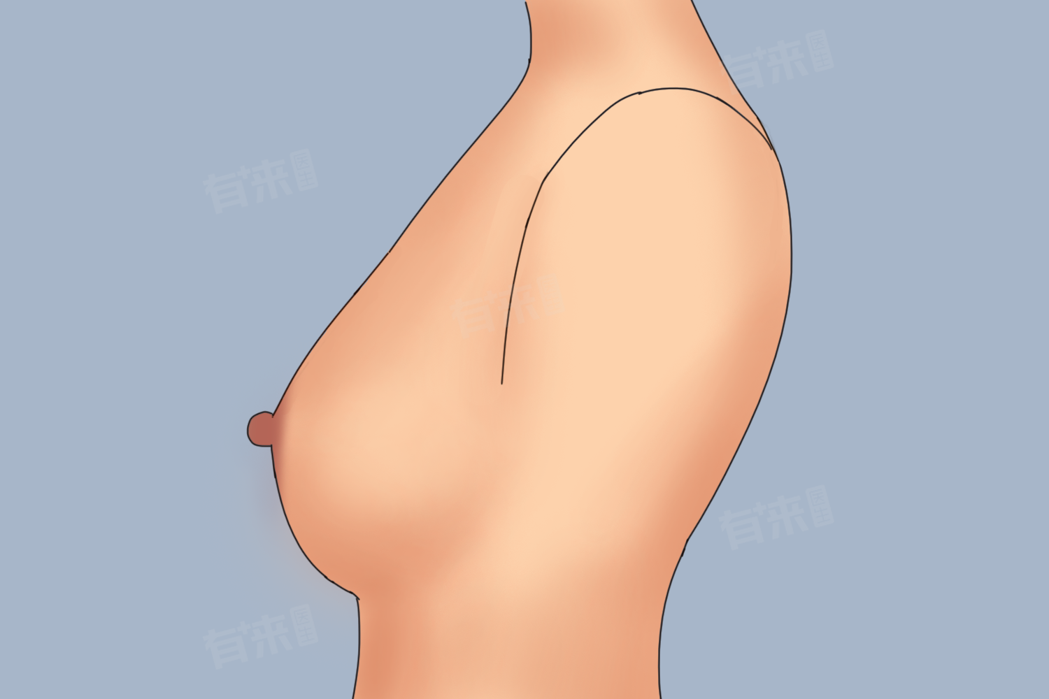 5、下垂型:乳房整体呈现下垂状态。根据下垂程度可分为轻度、中度和重度下垂。轻度下垂时,乳头位置在乳房下皱襞以上;中度下垂,乳头位置在乳房下皱襞以下,但在乳房最低位置以上;重度下垂,乳头位于乳房的最低位置,甚至低于乳房下皱襞。