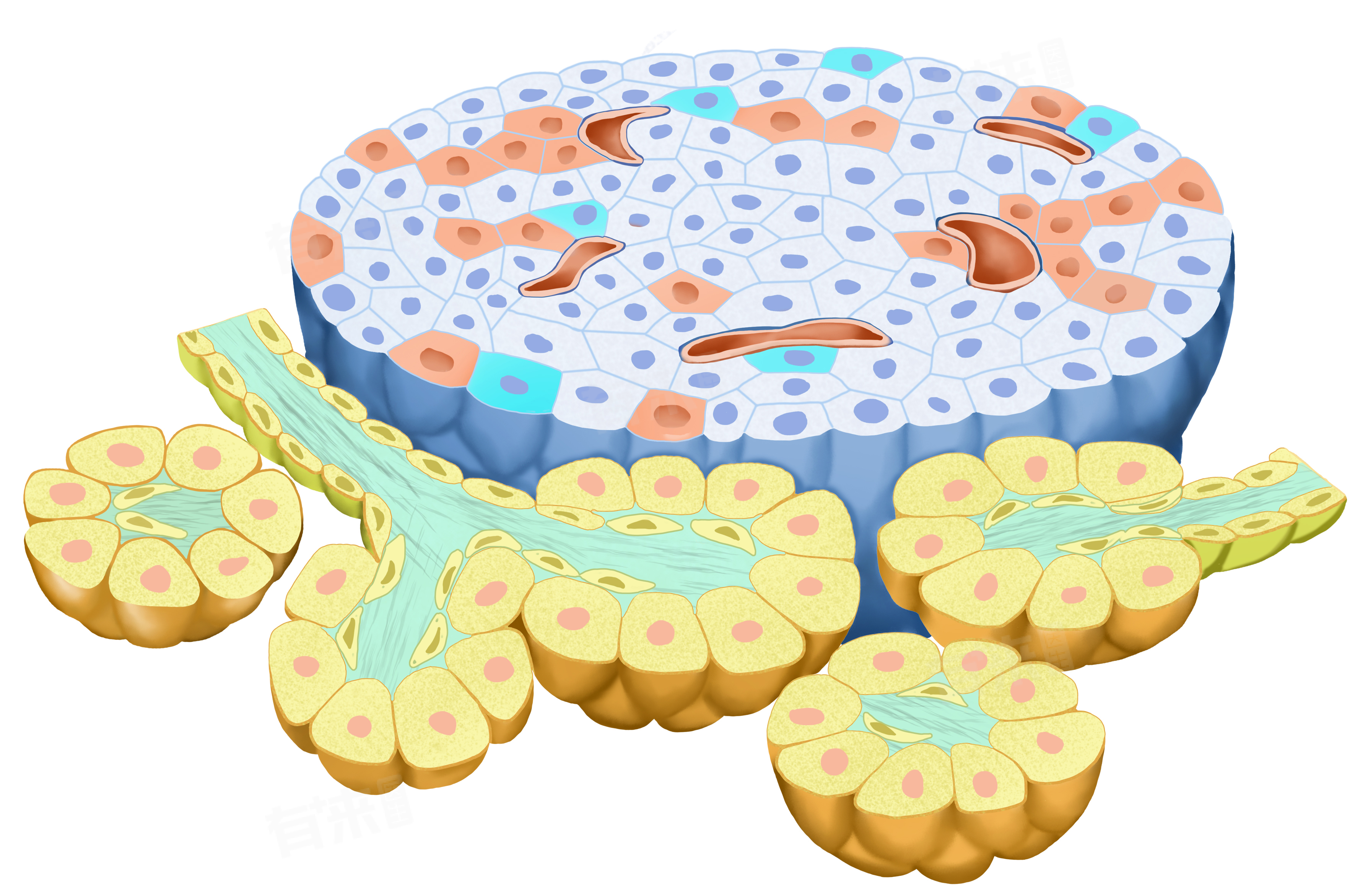 - 胰腺是位于腹腔深处的混合性腺体,不仅具有外分泌功能,还承担部分内分泌的作用。在外分泌方面,胰腺通过胰管分泌胰液,其中包含多种消化酶,如淀粉酶、脂肪酶和蛋白酶等,这些消化酶进入十二指肠后参与食物的消化过程。然而,在内分泌方面,胰腺能够通过其内部的胰岛细胞群,特别是胰岛β细胞,分泌出对人体至关重要的胰岛素。