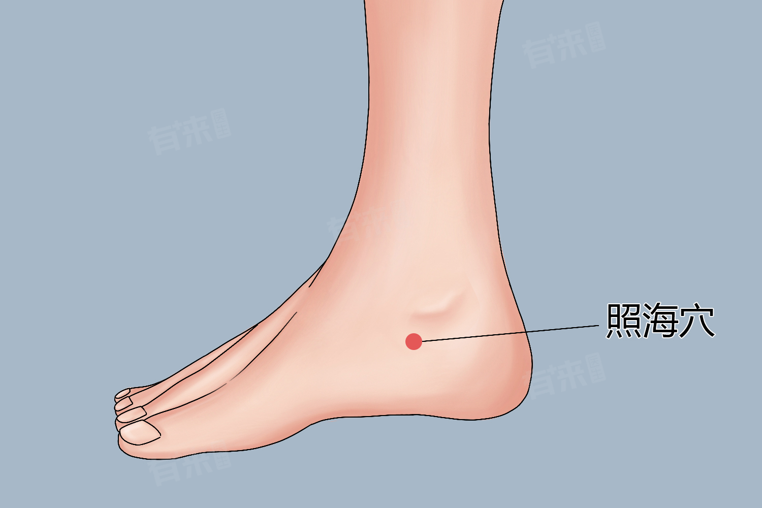 1、滋阴降火:照海穴属肾经,肾主水,该穴能滋肾阴、降虚火。临床常用于治疗阴虚火旺所致的咽喉干痛、口干舌燥、失眠多梦、潮热盗汗等症,尤其适用于更年期综合征或长期熬夜导致的虚火上炎。