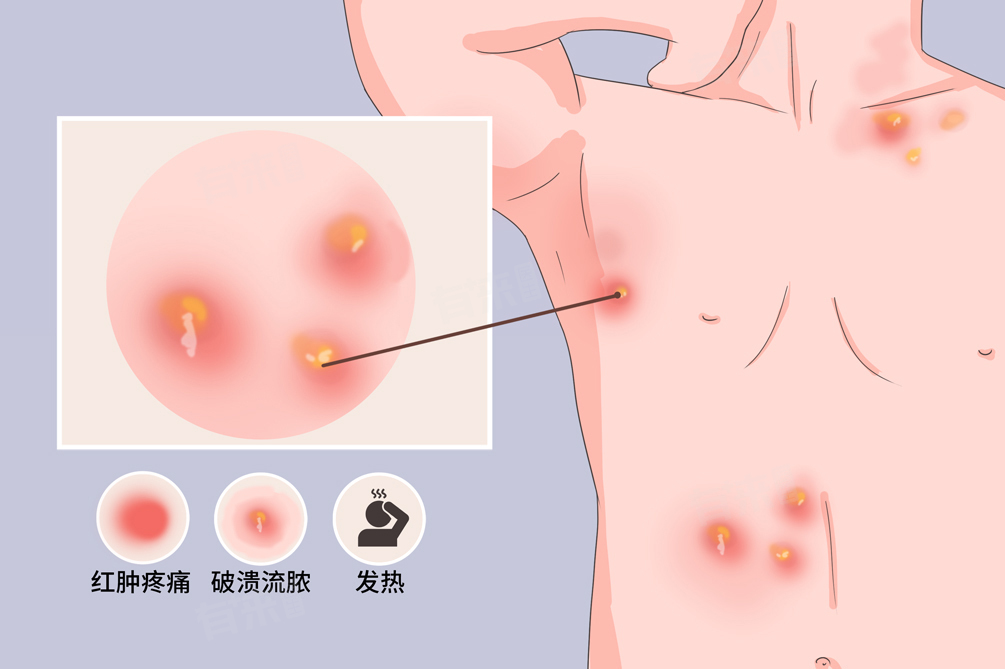 - 疖肿是由细菌侵入毛囊引发的一种急性化脓性炎症,常见于皮肤毛囊丰富的区域,如脸部、颈部、腋窝及臀部等。最初表现为一个红色、坚硬的小结节,伴随着轻微的疼痛或触痛感。随着病情的发展,该结节逐渐增大,中心部位可能出现黄白色点状突起,这是由于脓液积聚所致。此时,疼痛感加剧,周围组织可能出现红肿现象。
