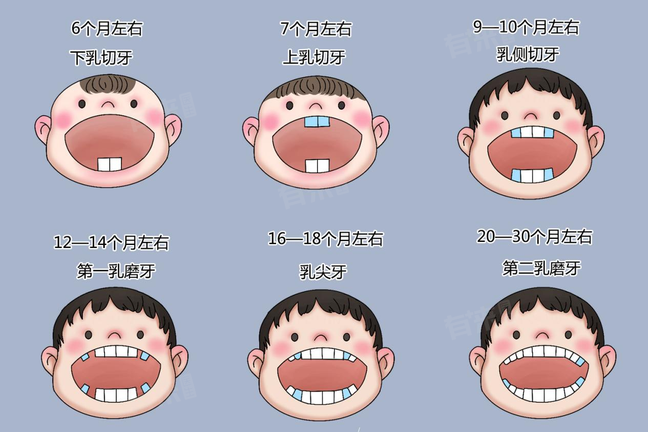 1、1岁左右出牙数(6-8颗):婴儿出牙时间和顺序存在个体差异,但多数在6-8个月开始出牙。牙齿的发育是一个渐进的过程,到1岁时孩子通常已经长出6-8颗牙齿。这是因为牙齿的萌出与孩子的生长发育紧密相关。在出生后的第一年,孩子身体各方面都在快速生长,包括颌骨的发育。颌骨的生长为牙齿的萌出提供了空间基础。牙胚在胚胎时期就已经开始形成,出生后在营养物质的支持下,如钙、磷等矿物质以及维生素D等营养元素的供应,牙胚逐渐发育成熟并开始萌出。一般先萌出下颌的中切牙,然后是上颌的中切牙,接着侧切牙等也会逐渐萌出,这是基于人类牙齿发育的正常生理顺序,所以1岁左右儿童有6-8颗牙齿。