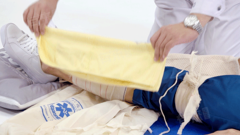 使用准备好的固定材料,如三角巾、绷带等,将健肢与伤肢紧紧捆绑在一起。捆绑时应从骨折部位上方开始,逐渐向下缠绕至骨折部位下方,确保固定牢固且稳定。对于开放性骨折,应先进行简单包扎,再行固定。固定过程中注意保持伤肢的自然体位,避免过度牵拉或扭曲。