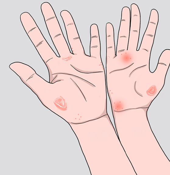 2、症状表现:手癣的症状包括瘙痒难忍,掌心、指侧可能出现针头至米粒大小的深在性水疱,疱壁发亮且较厚。水疱干燥后会形成白色点状或环形鳞屑,并伴有角质弥漫性变厚、粗糙和脱屑。而汗疱疹的水疱通常不会自行破裂,干燥后会形成脱皮,露出红色新生上皮,常伴有不同程度的灼热及瘙痒感。