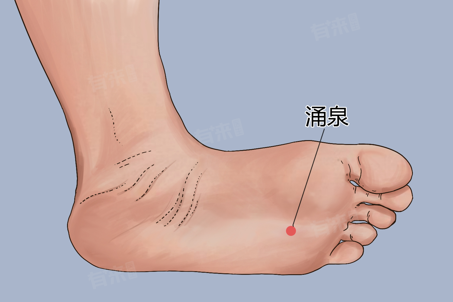 涌泉穴位于足底,屈足卷趾时足心最凹陷中,约当足底第2、3趾蹼缘与足跟连线的前1/3与后2/3交点凹陷中,该穴具有补肾固本、强身健体、缓解失眠、减轻头痛等作用。