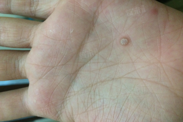 4、寻常疣:由人乳头瘤病毒(HPV)感染引起,可发生于手部任何部位,表现为黄豆大小或更大的与皮肤颜色一致或者偏棕褐色的丘疹,表面粗糙,摸上去硬度大于周围的皮肤,一般没有明显的自觉症状,但可能会逐渐增多。