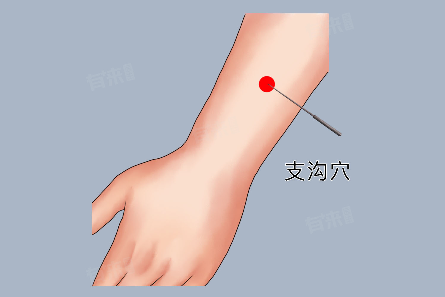- 支沟穴针刺时应注意避开桡动脉,采用直刺法,深度控制在0.5-1寸。由于该穴位于前臂伸侧,进针时应注意避开肌腱和神经。对于体质虚弱者,应采用轻刺激手法,避免过度捻转提插。