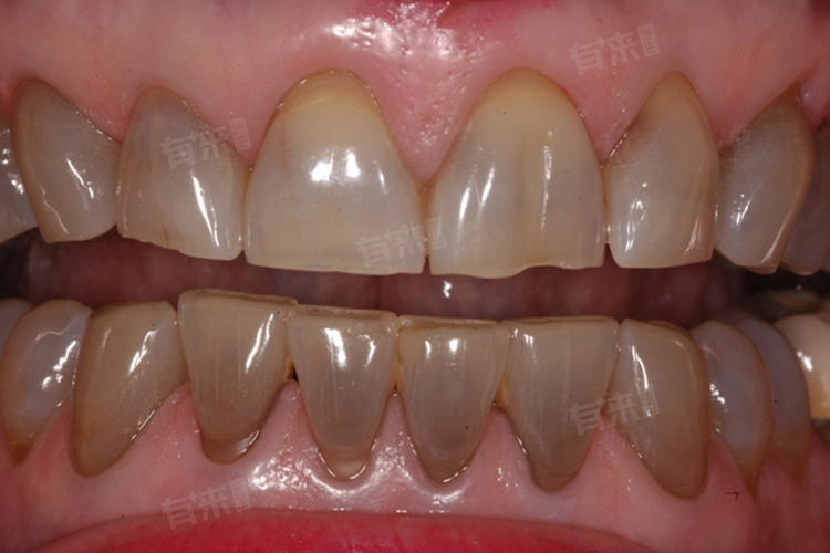 3、四环素牙与氟斑牙::在牙齿发育矿化期(妊娠4个月至8岁)摄入四环素类药物,药物与钙螯合形成稳定复合物,沉积于牙本质层,牙齿呈均匀灰黄色或深褐色。氟斑牙则因高氟地区饮用水氟含量超标(>1.5ppm),导致牙釉质发育不全,表面出现白垩色斑与棕褐色着色。此类情况需磨除牙釉质表面0.3-0.5mm,定制个性化瓷贴面(如二硅酸锂玻璃陶瓷),通过树脂粘结剂固定,可遮盖深褐色着色并模拟天然牙光泽,使用寿命达10-15年。