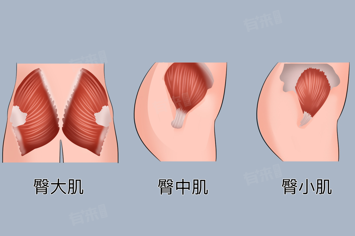 1、臀大肌:臀大肌是臀部最大的一块肌肉,位于臀部浅层,对于维持坐姿、行走和跑步等动作起着重要作用。臀大肌的按摩可以帮助缓解久坐导致的肌肉僵硬和酸痛,促进局部血液循环,加速代谢物的排出。