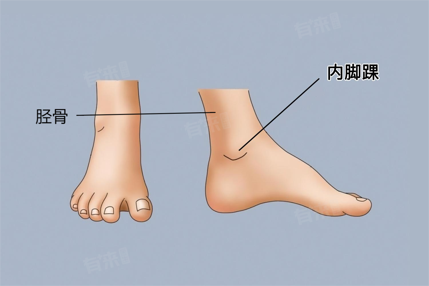 2、外踝:是腓骨远端的外侧部分,位置比内踝略低,同样在体表能够触及。外踝在维持踝关节的稳定性方面起着重要作用,当足部外翻时,外侧踝关节前方下方的骨性突出即为外踝。