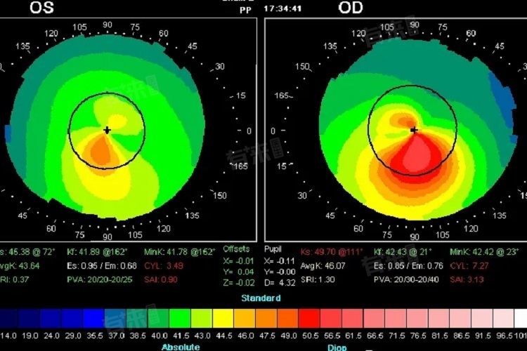 - 角膜地形图能够提供多个重要参数,角膜曲率是其中关键的参数之一,反映了角膜表面的弯曲程度,正常角膜近似于椭球形,不同部位的曲率存在差异。平均角膜曲率可帮助医生了解角膜的整体形态,判断是否存在散光等问题。