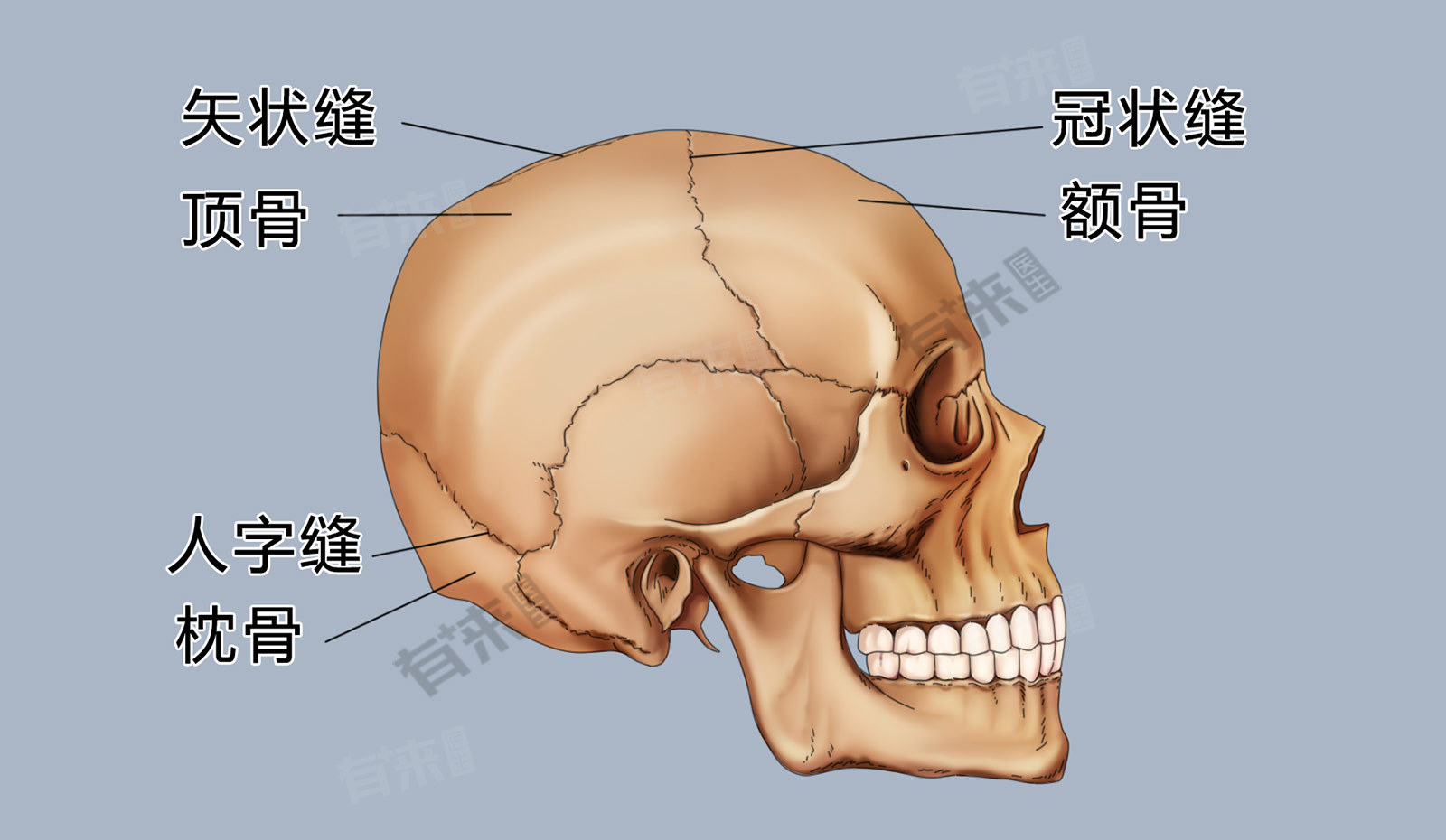 顶骨属于脑颅骨,是构成颅腔的重要组成部分。从位置和形态来看,顶骨位于颅骨的顶部,左右各一,共同守护着大脑。它们大致呈四边形,具有一定的弧度,与其他颅骨相互连接,形成一个完整的颅腔结构。