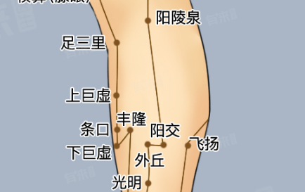 2、丰隆穴:位于外踝上8寸,条口穴(犊鼻下8寸,犊鼻与解溪的连线上)外一横指处。具有祛疾降逆、疏经活络的功效,是治痰的重要穴位,也常用于治疗头痛、眩晕、癫狂病等。