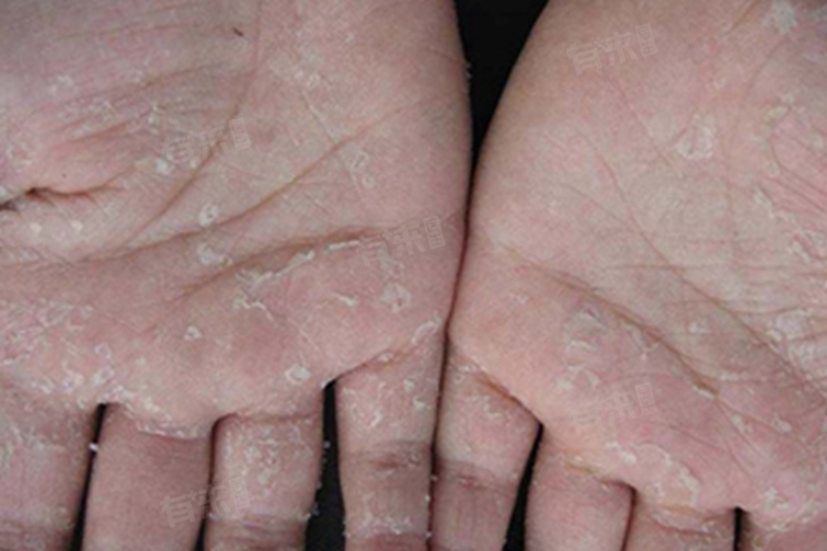 7、剥脱性角质松解症:病因尚不完全清楚,可能与遗传、多汗等因素有关。主要表现为掌跖部角质层剥脱,皮损可逐渐向四周扩大,一般无瘙痒症状。