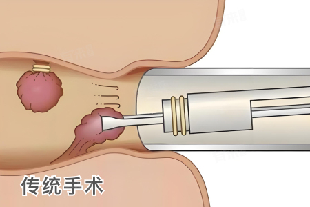 传统手术:用手术刀或吻合器直接切除充血的痔组织,需切开皮肤和黏膜,创口直径可达5-10mm,可能伴随出血、疼痛和瘢痕风险。