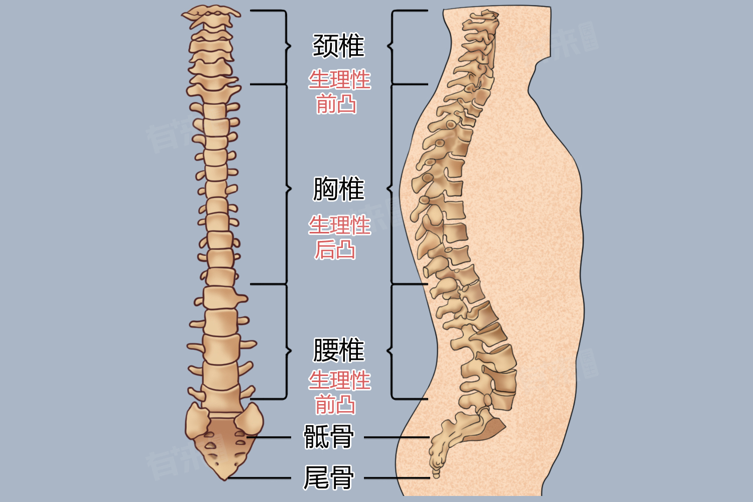 - 骶椎:在成年人中,骶椎通常由5节融合而成,形成一块骶骨,标记为S1-S5,但实际上是融合后的单一结构。这部分脊骨主要起到支撑骨盆和保护骨盆内器官的作用。