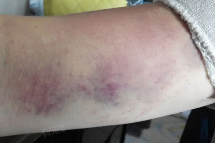 2、中期皮下淤血:形成2-3天后皮下淤血颜色逐渐变为紫红色,红细胞内的血红蛋白开始分解,氧合血红蛋白转化为去氧血红蛋白,颜色加深。淤血区域肿胀稍有消退,但触摸仍有硬块感,疼痛程度较初期有所减轻,范围可能稍有扩散。