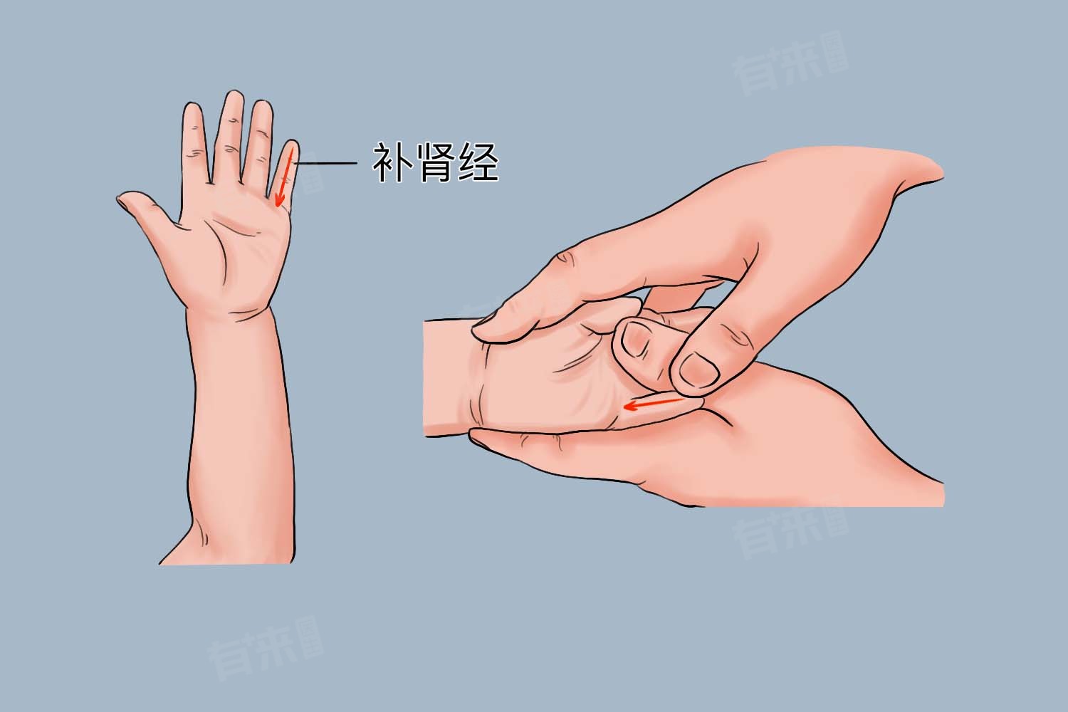 - 找对位置:补肾经的推拿主要位于小指的末节螺纹面,轻轻摸上去会感觉到一个小凹陷,这就是肾经穴的所在位置。
