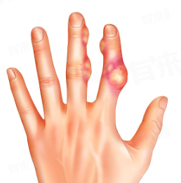 4、类风湿结节:类风湿关节炎患者,在疾病活动期可能出现类风湿结节。多位于关节隆突部及受压部位的皮下,如手指关节伸侧,结节大小不一,质地坚硬,一般无压痛。