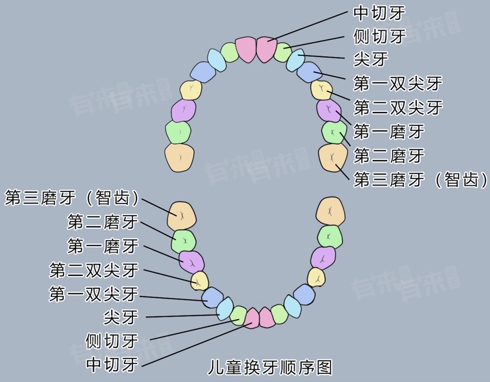 - 换牙的顺序通常遵循先下后上、左右对称的原则,在6-9岁期间,小孩会逐渐替换乳切牙和乳侧切牙。到了11-12岁时,乳尖牙开始脱落,第一前磨牙开始萌出。而在10-12岁时,乳磨牙脱落,第二前磨牙、第二磨牙逐渐长出,替换过程逐渐完成。