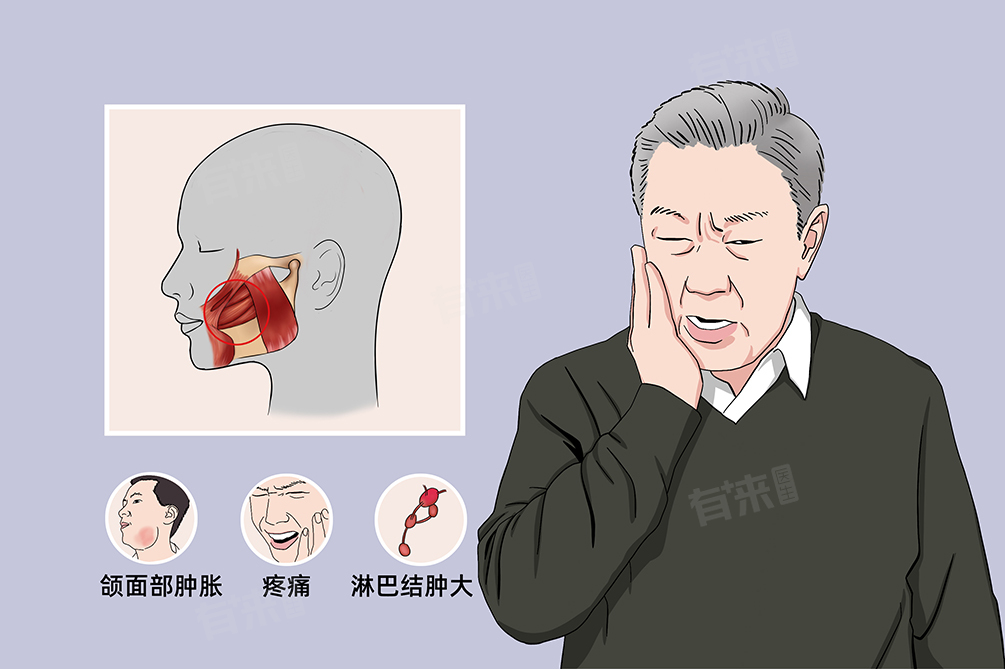 4、颌面部间隙感染:口腔、面部的炎症扩散至颌面部间隙,可引起腮帮子肿大。常见的感染来源包括牙源性感染、腺源性感染等。感染区域除肿胀外,还伴有明显压痛、皮温升高,严重时可出现张口受限、全身发热等症状。