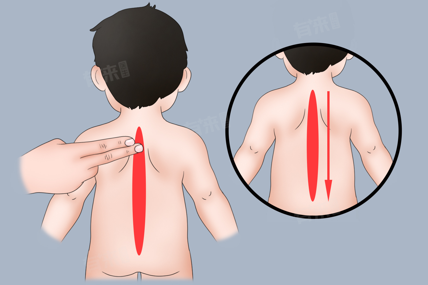 7、推脊法:后背正中,从大椎穴至尾骨端的长强穴的直线。暴露小孩儿的背部,按摩者以拇指螺纹面或食、中二指指腹直推此直线,推100-200次。改善脾胃功能、促进消化,有助于整体机能的恢复。