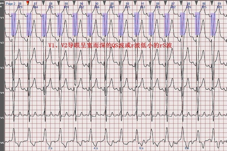 3、V1、V2导联S波宽大:与V5、V6导联相反,V1、V2导联中的S波会变得宽大且深。这反映了左心室激动延迟对心电图波形的影响,使得S波在心电图上的表现更为显著。