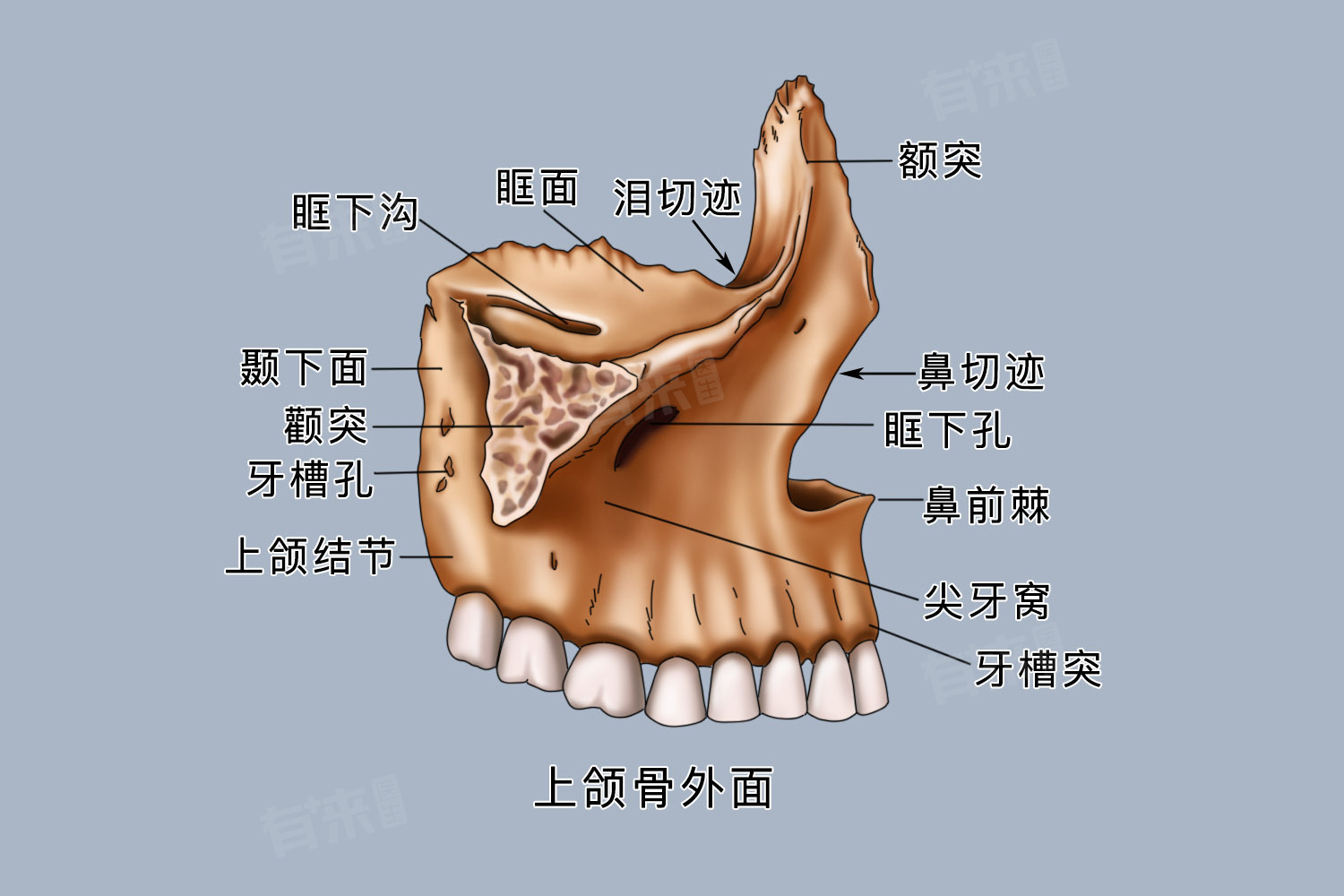 - 上颌骨额突骨位于上颌体的内上方,是一个不规则骨结构的一部分。上颌骨额突骨的上端与额骨相接,形成额上颌缝,该连接结构在面部骨骼中起到了重要的支撑作用。