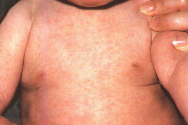 - 热退疹出:发热3-5天后,体温降至正常,随后出现皮疹。皮疹一般为红色的充血性斑丘疹,可分布在颜面部、躯干、四肢,偶尔可能并发脑炎或血小板减少性紫癜,皮疹通常持续1-2天自然消退,且不伴痒感。部分患儿可能出现恶心、呕吐、头疼、头晕等症状,严重者可能出现惊厥、耳后枕部淋巴结肿大等。
