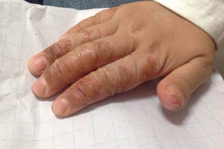 4、汗疱疹:汗疱疹与出汗异常、过敏等因素有关。宝宝手部汗腺相对发达,当出汗不畅时,汗液在皮肤内积聚形成小水疱。初期手指会出现针尖至米粒大小的水疱,水疱破裂干涸后,就会出现脱皮现象,同时可能伴有不同程度的灼热和瘙痒感。