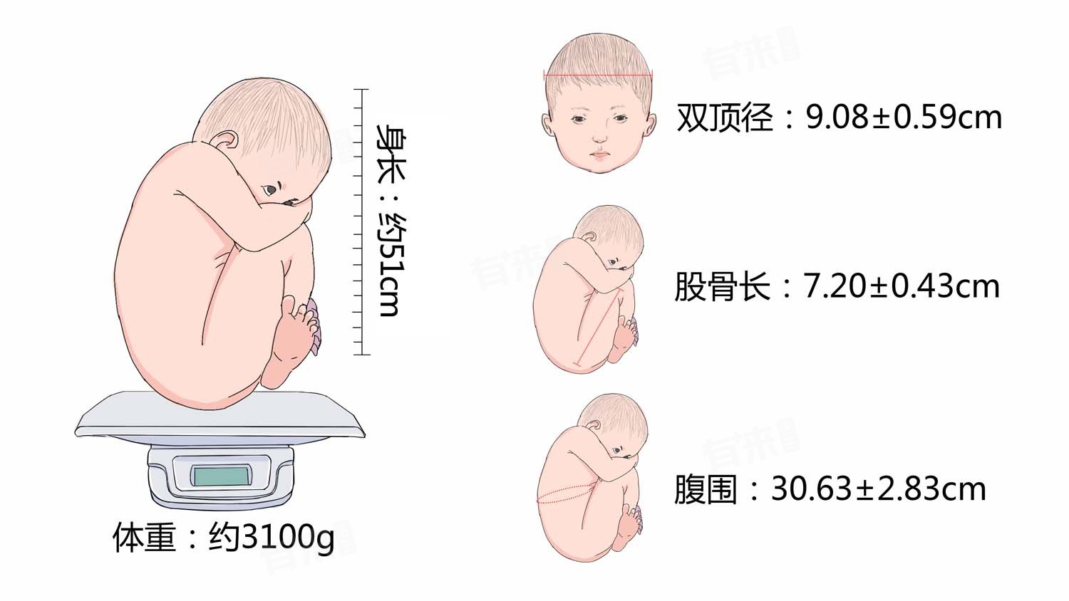 - 如果38周胎儿的双顶径略大于或小于正常范围,医生通常会结合其他指标,如腹围、股骨长、头围等,以及孕妇的身体状况、孕期的各项检查结果来综合评估胎儿的健康状况。