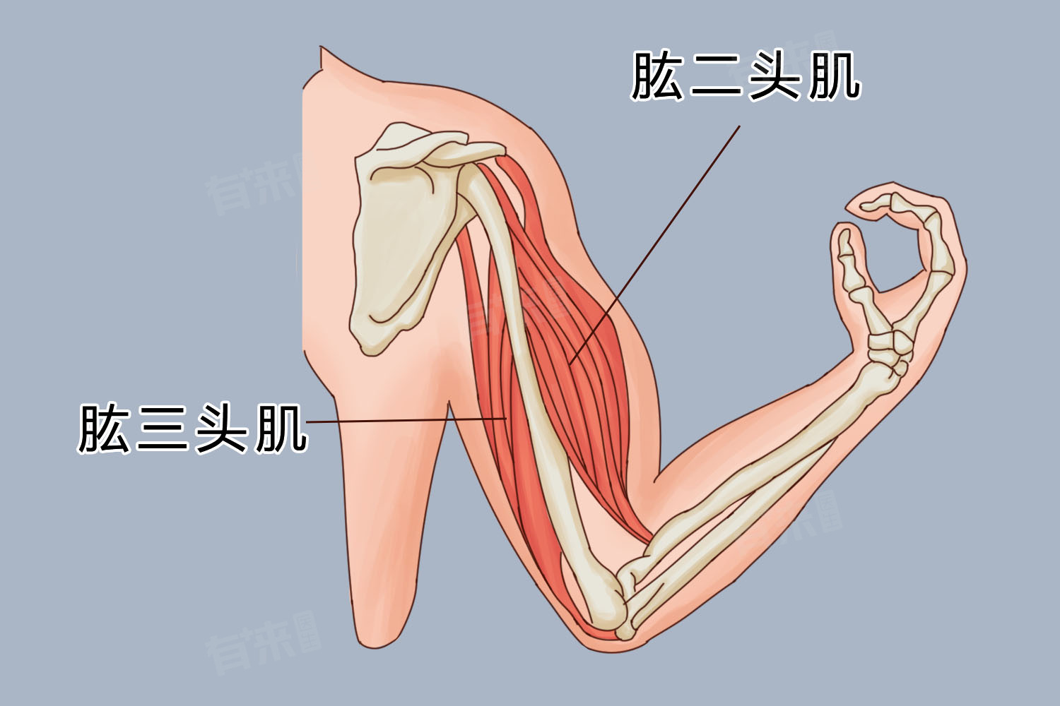 二头肌通过肌腱与肩胛骨和桡骨相连,使其能借助肌肉收缩拉动骨骼,实现屈肘动作。而三头肌与肩胛骨、肱骨及尺骨相连,收缩时能推动尺骨,让肘关节伸直,完成手臂伸展。