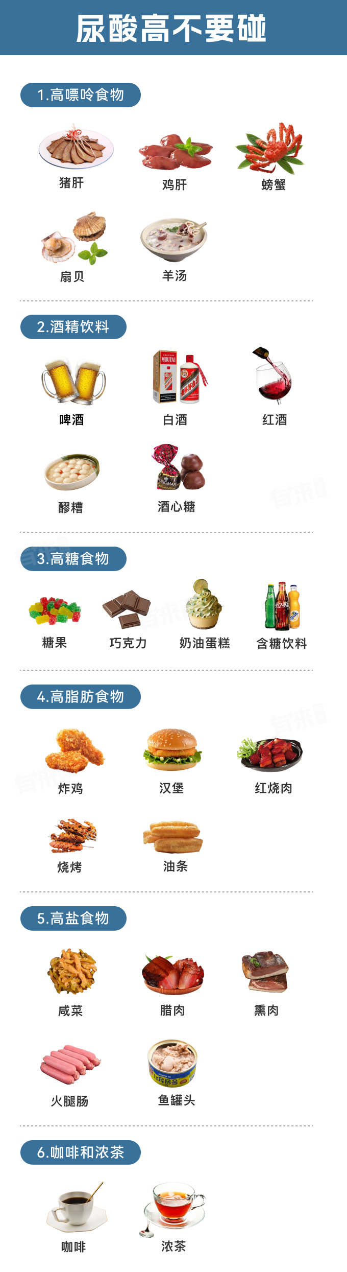 限制高嘌呤食物,如动物内脏、海鲜、浓肉汤,减少尿酸生成。增加低脂乳制品、新鲜蔬菜和水果如樱桃、柠檬摄入,帮助碱化尿液。避免酒精尤其是啤酒,和含糖饮料,以防摄入过多嘌呤导致尿酸生成过多以及尿酸排泄受阻。