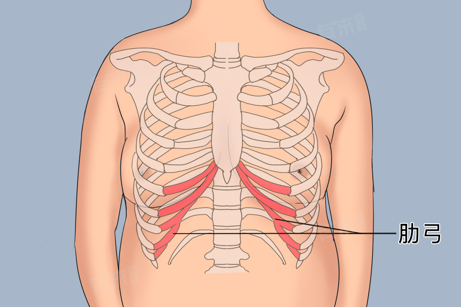 - 从正面观察,肋弓起始于胸廓两侧第7肋软骨的外侧端。第7肋软骨在前正中线与胸骨剑突结合,而其外侧端则与第8肋软骨相连,第8至10肋软骨依次连于上位肋软骨,由此在胸廓前下部形成左右对称的弓形结构。