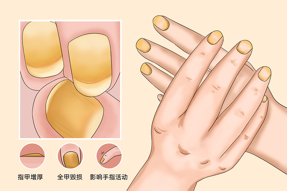 - 真菌感染:指甲发黄最常见的原因之一是真菌感染,即甲癣或甲真菌病。当皮癣菌侵犯甲板或甲下时,会导致指甲颜色异常,多呈灰黄或灰褐色,并伴有指甲增厚、凸凹不平、失去光泽、破损等症状。