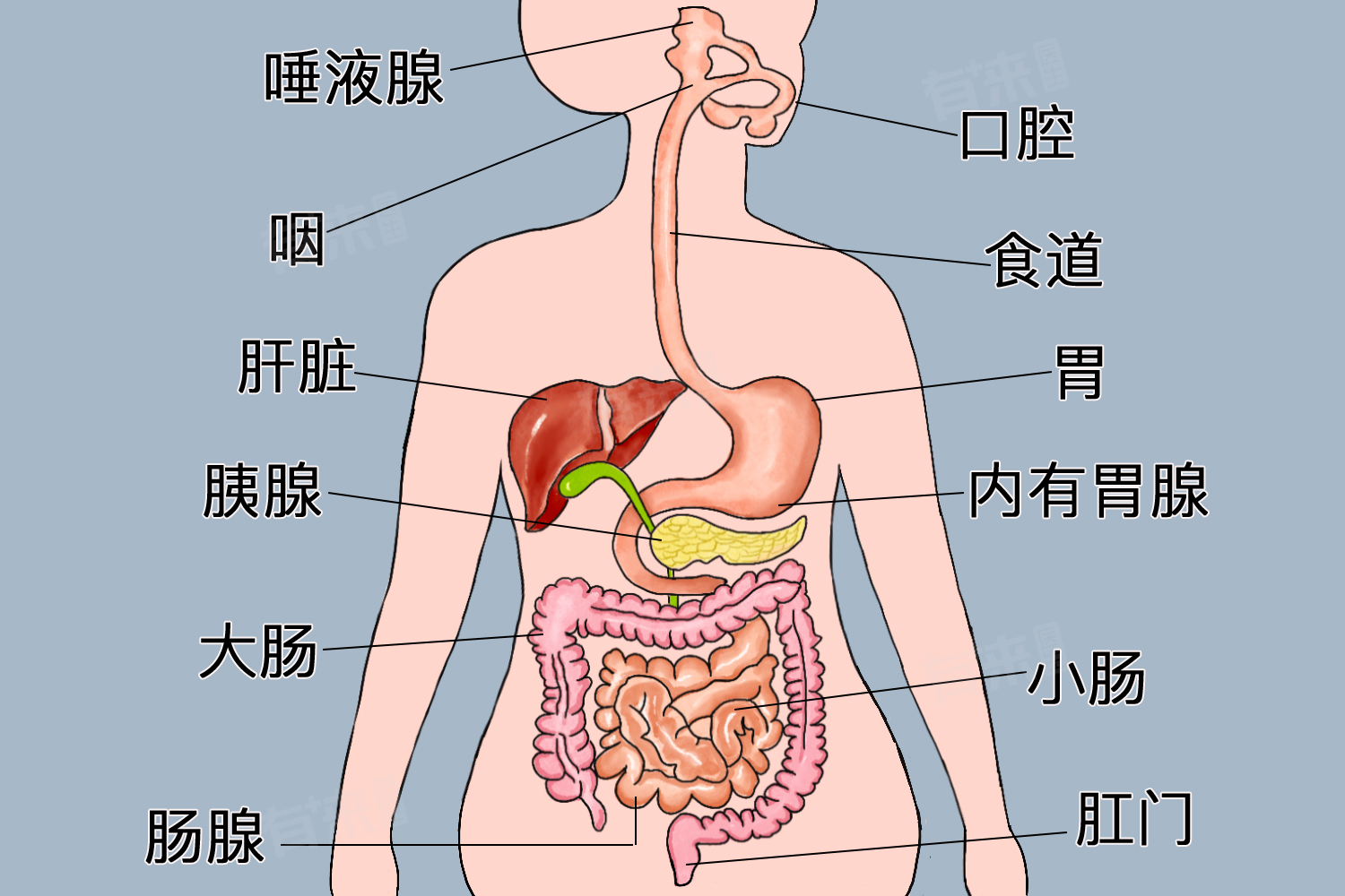2、消化系统:包括消化道和消化腺。消化道由口腔、咽、食管、胃、小肠、大肠和肛门组成,负责食物的摄入、消化和吸收。消化腺如唾液腺、肝脏、胰腺等,分泌消化液帮助消化食物。消化系统将食物转化为营养物质,为身体提供能量。
