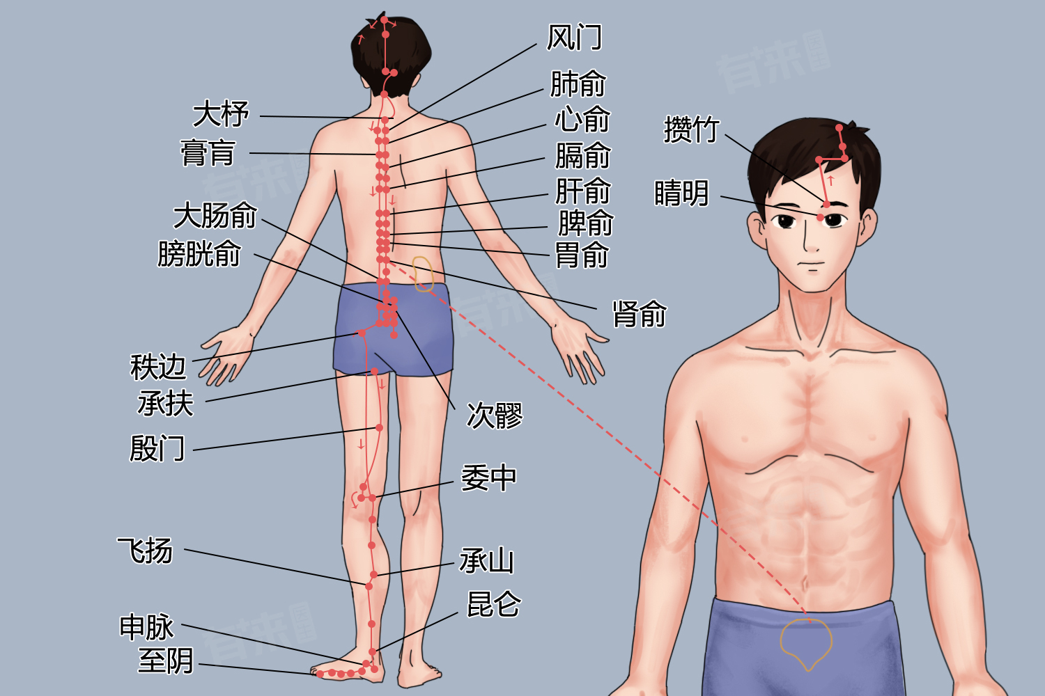 1、排毒:膀胱经与尿液的排泄密切相关。通过促进体内的新陈代谢和血液循环,膀胱经帮助身体有效排出多余的废物、毒素和水分,维持身体的内环境平衡。对于预防疾病、保持身体健康至关重要。