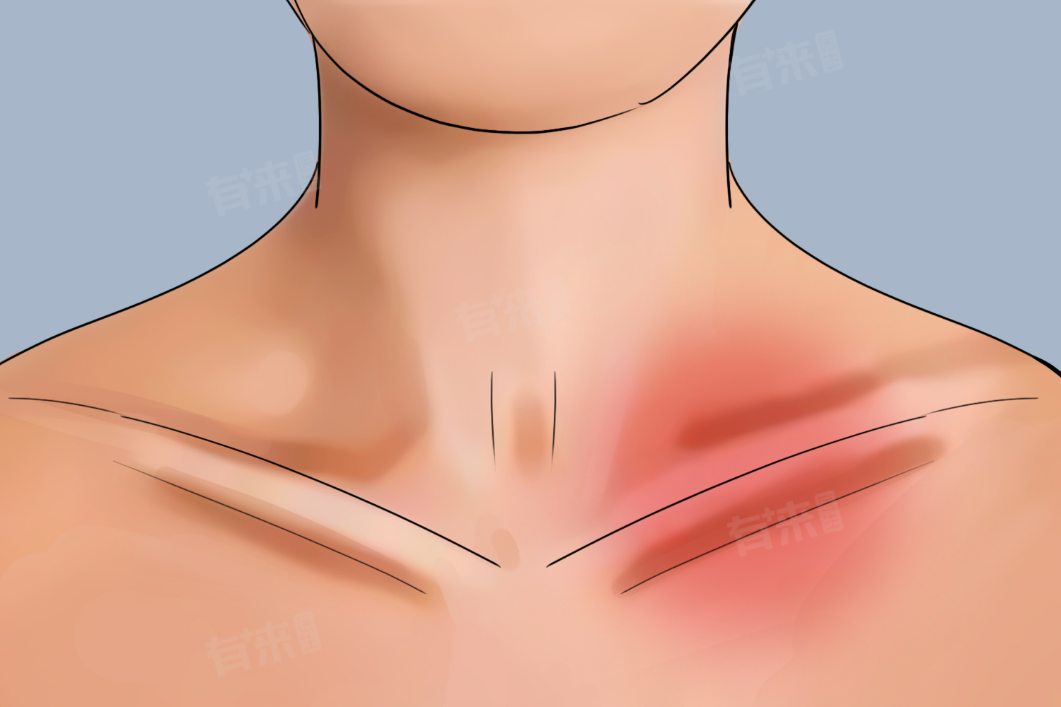 2、外伤:如摔倒、碰撞等外力作用可能引起左锁骨受伤,包括骨折、骨裂或软组织损伤,受伤后锁骨部位会出现明显疼痛、肿胀,活动受限。若怀疑有骨折等严重损伤,应及时就医进行 X 光等检查,根据损伤程度进行相应治疗,如固定、手术等。