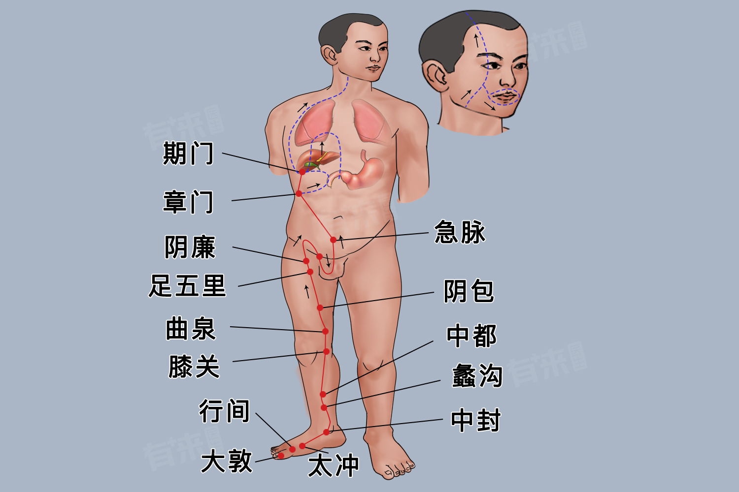 - 起于足大趾爪甲后丛毛处,沿足背内侧向上经过内踝前一寸处,向上至小腿内侧,在内踝上八寸处交出足太阴脾经之后,上行过膝内侧,沿大腿内侧中线进入阴毛中,环绕阴器,至小腹。主要作用是起到主疏泄,调畅气机,对情绪调节、气血运行起关键作用,与女性生殖系统密切相关,影响月经、带下等生理功能。