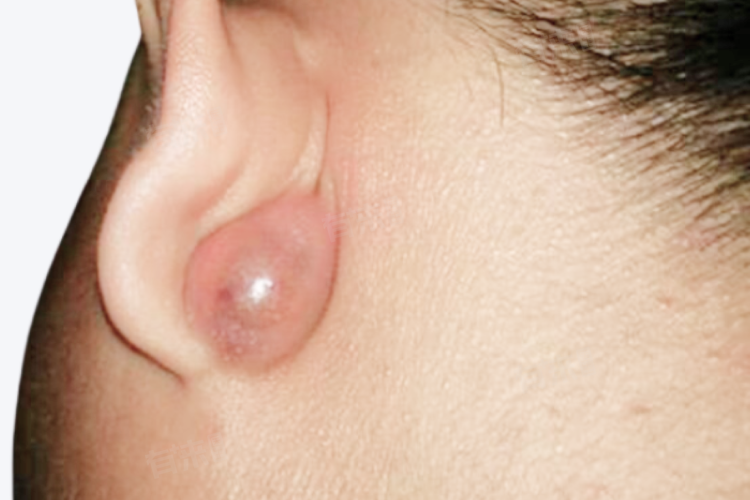 3、皮脂腺囊肿合并感染:耳唇根部的皮脂腺分泌旺盛,若皮脂腺导管堵塞,皮脂腺分泌物无法正常排出就会形成囊肿。囊肿一般呈圆形,中等硬度,中央可有小黑点。当囊肿合并细菌感染时,会出现疼痛、红肿,按压时疼痛加剧,严重时还可能化脓,破溃后有脓性分泌物排出。