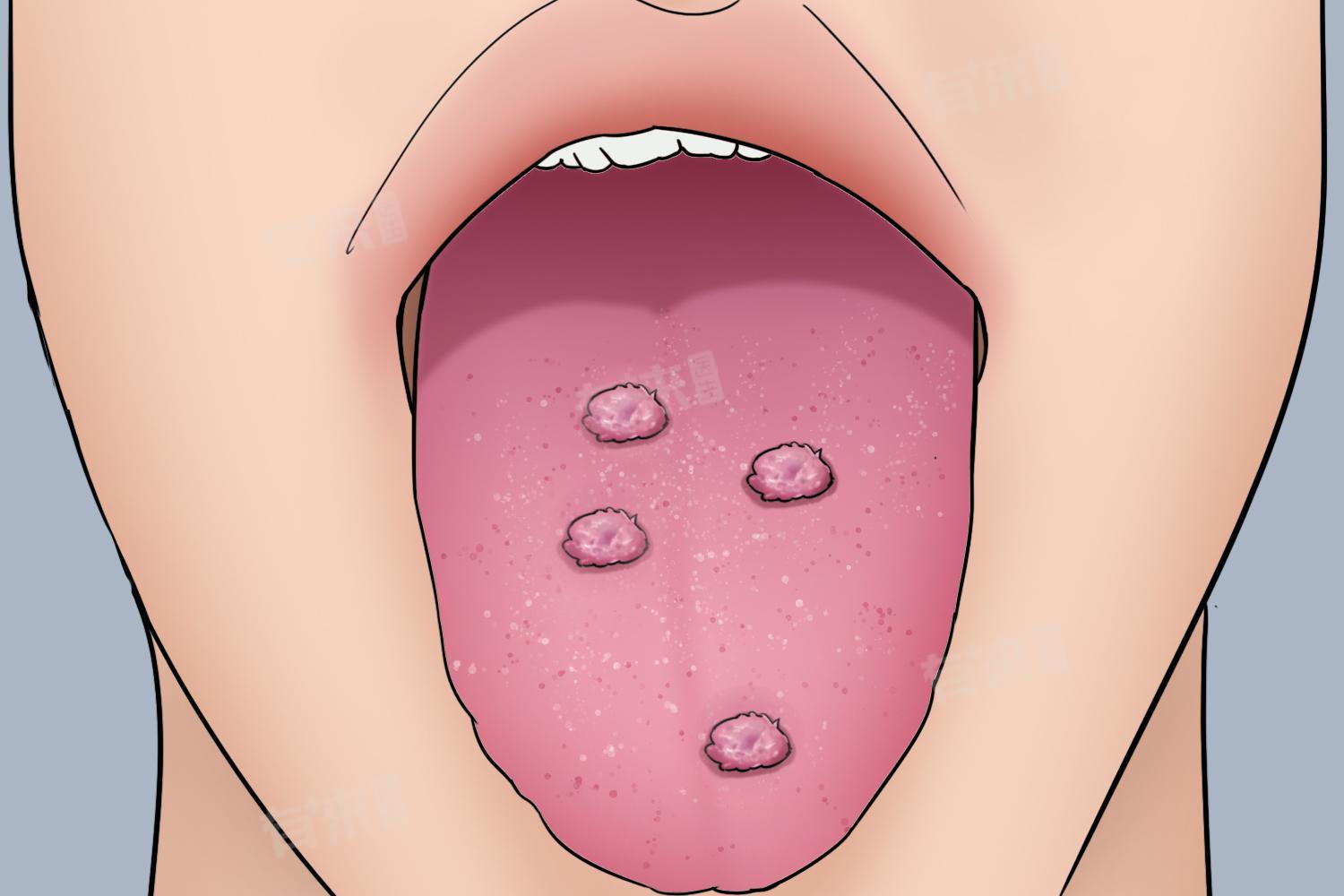 - 由病毒感染引起,如单纯疱疹病毒,表现为舌头表面的水疱,周围伴有红晕。当身体免疫力下降时,如过度疲劳、感冒后,容易发生病毒感染。