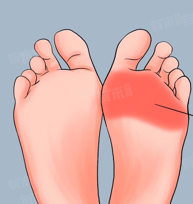 5、足底筋膜炎:足底筋膜炎是足底筋膜的无菌性炎症,常表现为脚掌中央或跟部疼痛,患者可能在晨起或刚开始活动时感到疼痛,随着活动的继续,疼痛可能会逐渐减轻。