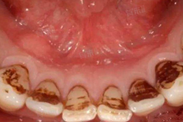 5、四环素牙:在牙齿发育阶段,若服用四环素类药物,药物会与牙齿硬组织中的钙结合,形成稳定的四环素-钙复合物,沉积在牙本质中,导致牙齿变色,从最初的黄色逐渐变为棕色、灰色甚至黑色,且牙齿内部表面的黑色更为明显。