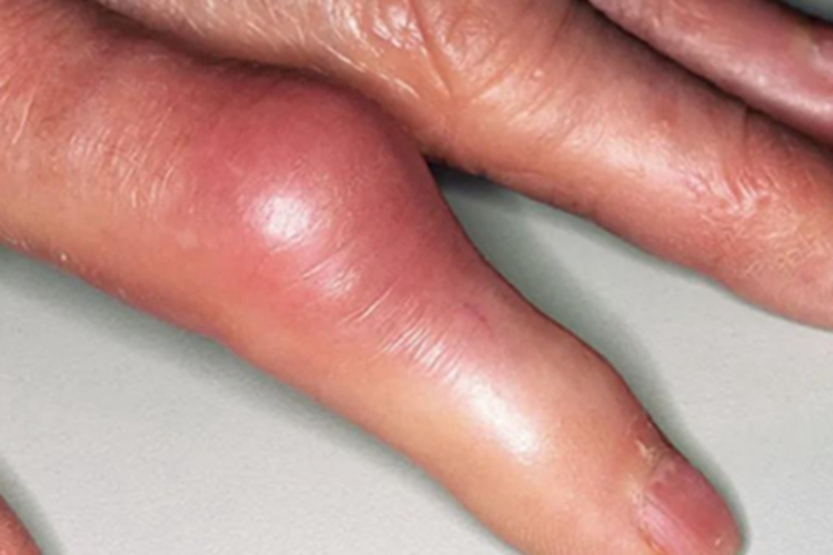3、痛风性关节炎:痛风性关节炎是由于尿酸盐沉积在关节囊、滑囊、软骨、骨质和其他组织中而引起病损及炎性反应,当痛风性关节炎累及手指关节时,可能出现关节红肿、胀痛,并可能形成痛风石,表现为硬硬的凸起。对于痛风性关节炎的治疗,需要控制尿酸水平,采用药物治疗、饮食调整等方法。