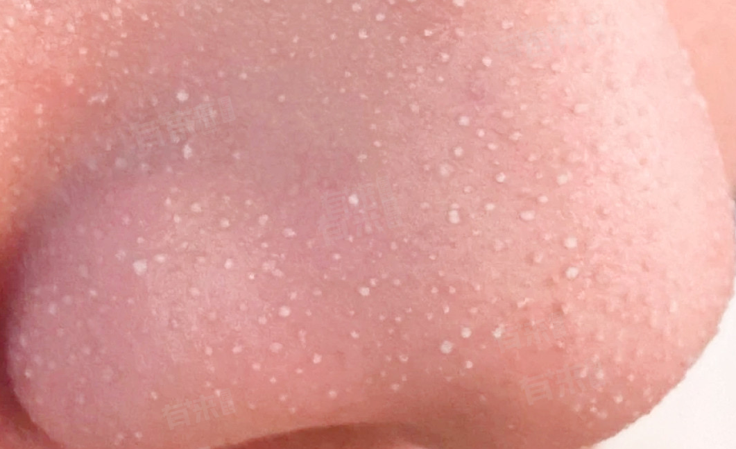 3、粉刺:粉刺是痤疮的一种表现形式,分为白头粉刺和黑头粉刺。白头粉刺是由于皮脂腺分泌过多油脂,毛囊口角化异常,导致皮脂无法排出,在毛囊内堆积形成闭合性粉刺,外观呈白色米粒大小的丘疹。青春期人群因雄激素水平升高,皮脂腺分泌旺盛,容易出现粉刺;此外,高糖、高脂肪饮食,精神压力过大等因素,也会刺激皮脂腺分泌,诱发粉刺。