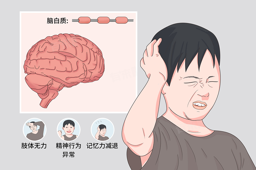 - 脑白质病:脑白质中的中枢神经细胞的髓鞘损害会引起脑白质病。这是一种大脑的结构性改变,以中枢神经细胞的髓鞘损害为主要特征,病变会累及专门发挥高级大脑功能的白质束。其临床表现包括注意力不集中、健忘、个性改变,甚至痴呆、昏迷等严重后果。